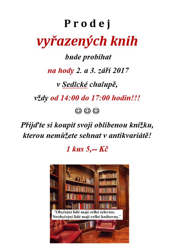 V sedlcké chalupě bude současně probíhat prodej vyřazených knih z knihovny za jednotnou cenu 5 Kč/ks.