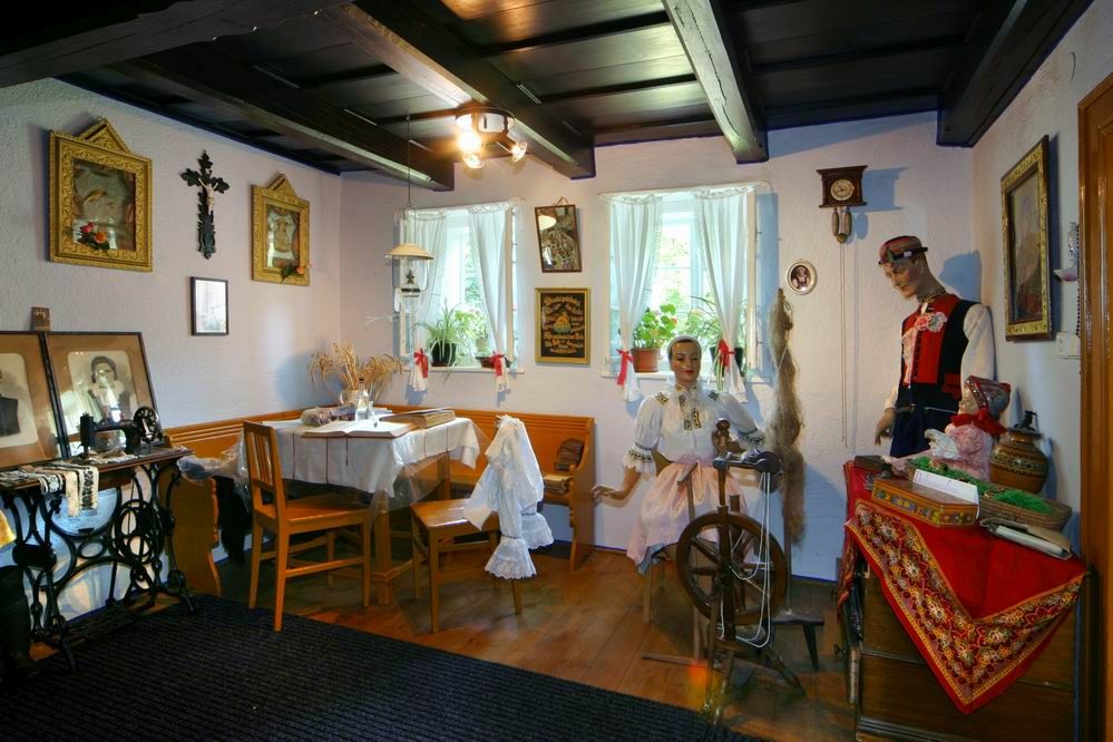 Jakmile vstoupíte dveřmi z „forhausu“ domu do první místnosti – „izby“, podle níž vlastně expozice dostala název, padne váš zrak asi nejprve na robustní pec s kachlovými kamny. Bohužel není původní, musela být pro účely prezentace dostavěna. Na peci našly místo např. formy na máslo a “ tvaroh, vedle kamen jsou zase čepáky, zde pojmenované „kubaně“. Nad pecí a kolem ní je rozvěšeno několik kusů oděvu dřívějších rolníků, z nichž můžeme připomenout aspoň kožich dubeňák či kmotrovský kabát; celá řada krojů je navíc v expozici k vidění rovnou na figurínách – u pece třeba ženich se svou nastávající, jež v ruce drží „opalák“ (složený šátek se střapci, atribut to nevěsty). Vlevo od vchodu do izby je kout s manželskou „pohrádkou“ s vysoko nastlanými peřinami a kolébka i s „opúlkou“, kterou si matka při práci zavinovala na tělo dítě. No a také figurína v kroji babičky. Vpravo lze spatřit další skupinu figurín -otce, vdanou ženu (i s jejím znakem, čepcem na hlavě) u kolovratu, dítě sedící na truhle, kde jsou též ukázky zdobených kraslic. V rohu naproti dveří stojí zbylé základní vybavení místnosti: stůl s židlemi a „lávou“, nad níž visí jako vždy kříž a svaté obrázky; poblíž je rovněž šicí stroj. Na stáří izby odkazuje trámový strop s hlavním trámem (tzv. roštem) s letopočtem 1887.